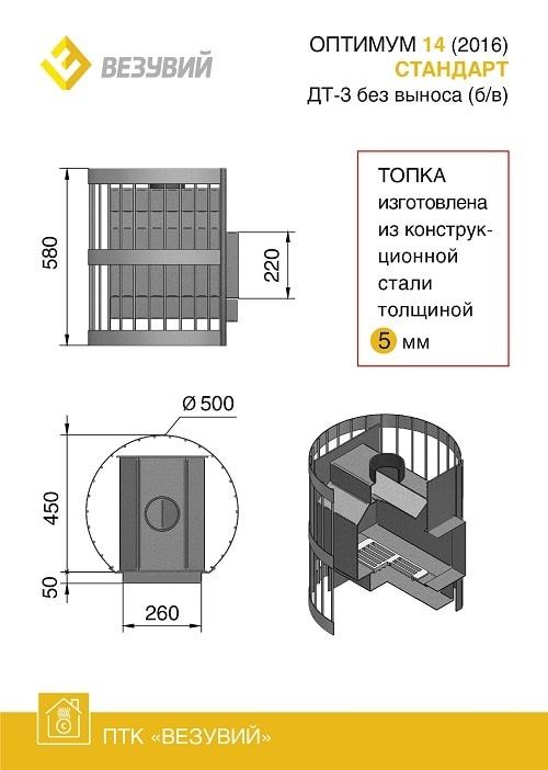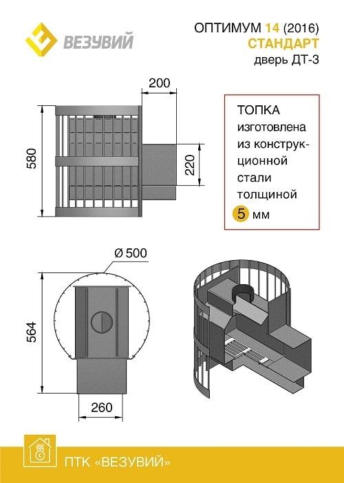 Печь для бани Везувий Оптимум Стандарт 14 (ДТ-3) 2016 оснащена выносным топливным каналом с чугунной дверцей. Выносной топливный канал предназначен для топки печи из смежного помещения, что позволяет сохранить помещение парной в чистоте.